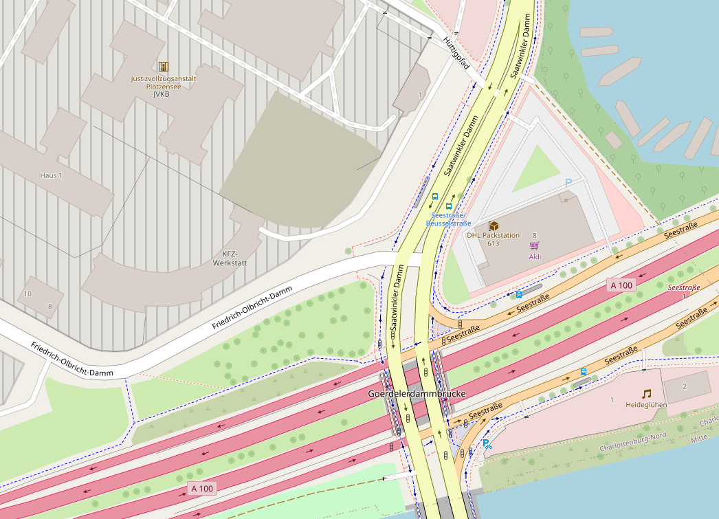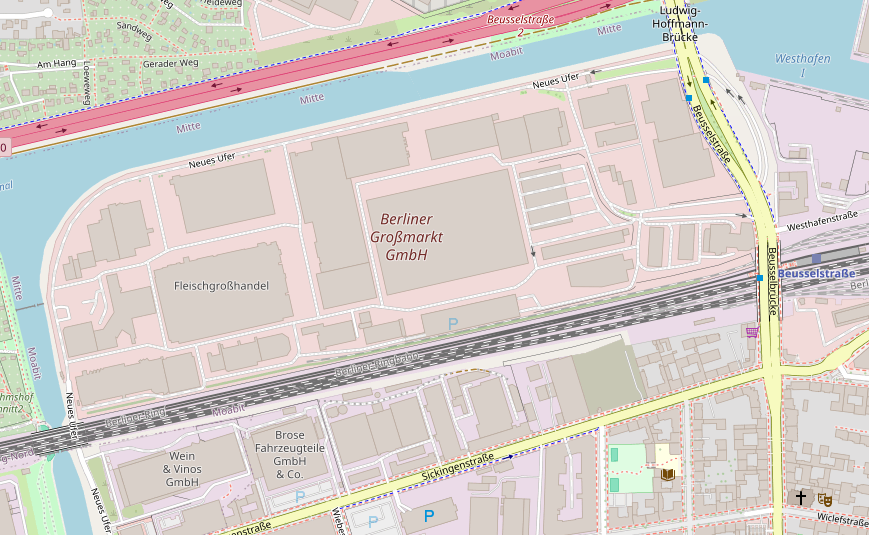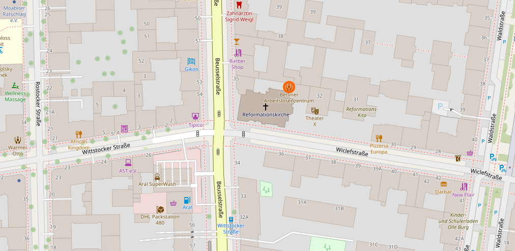 A100 Abfahrt Beusselstraße, rechts 350 Meter Beusselstraße, dann zum Parken links in die Wiclefstraße (Zone 74) oder rechts in die Witstocker Straße (Zone 73) abbiegen.
