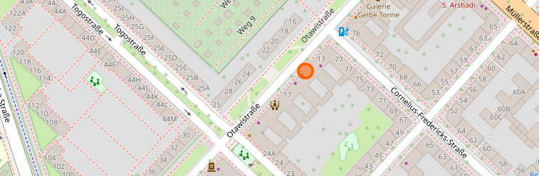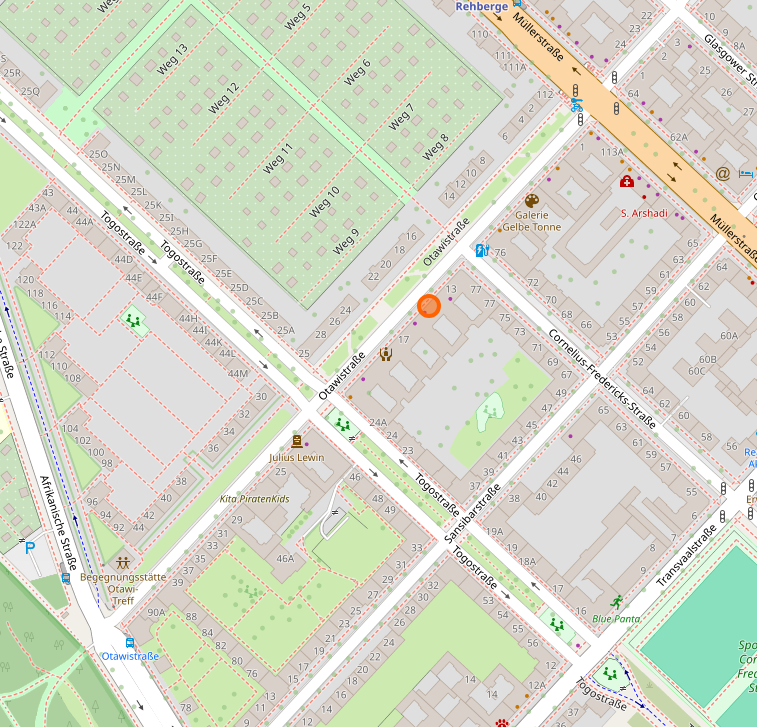 Von Müllerstraße oder Afrikanischer Straße in die Otawistraße einbiegen. Der Kieztreff befindet sich zwischen Cornelius-Fredericks-Straße (ehem. Lüderitzstraße) und Togostraße.